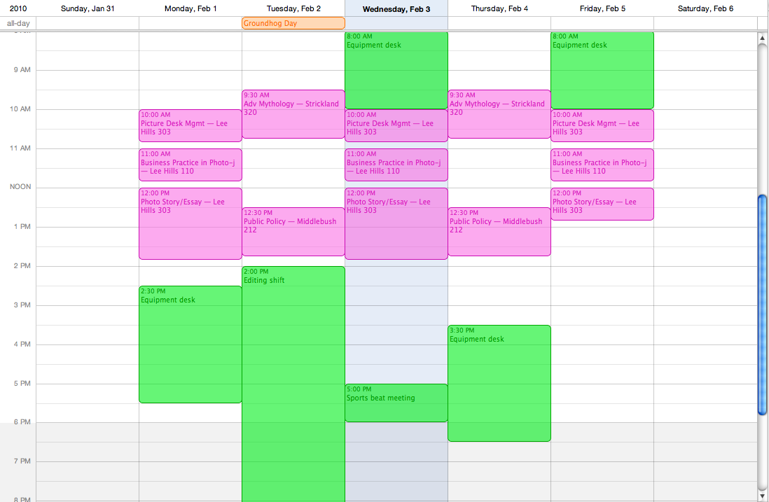 My weekly schedule, not including my occasional photo-editing shifts on Fridays, Saturdays, and/or Sundays. The purple are classes; the green are worktime or photo-editing duties.