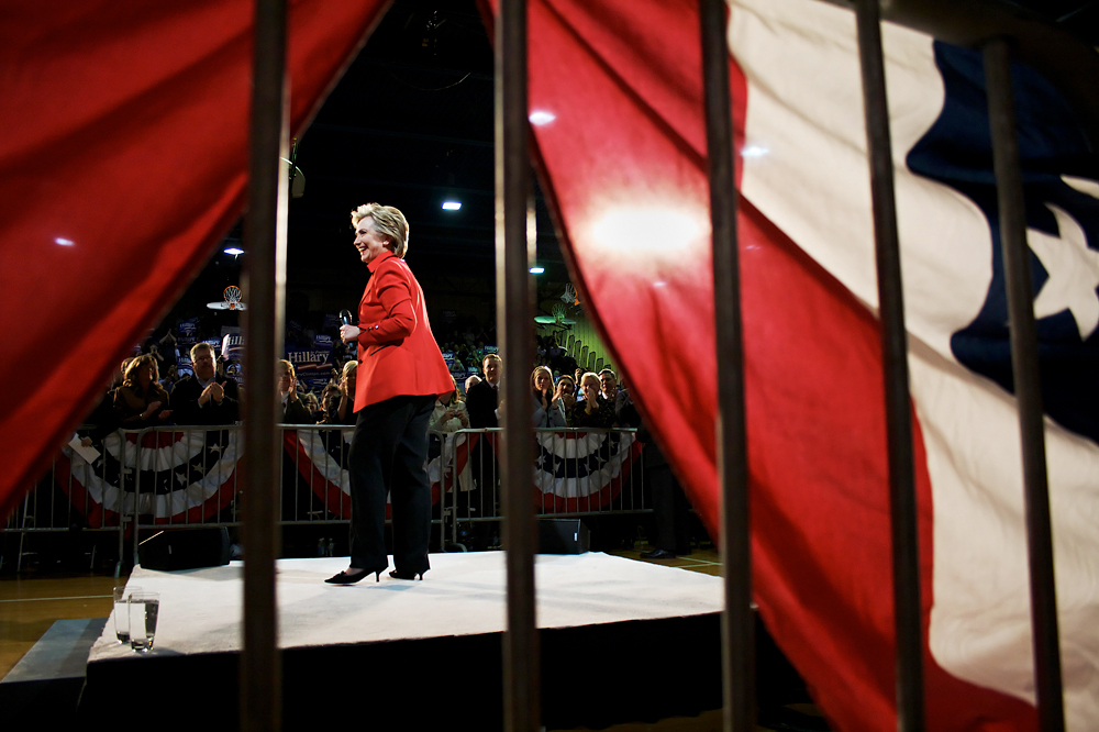 Sen. Hillary Clinton, D-N.Y., concludes her speech to more than 5,000 supporters on Jan. 19, 2008, in the McCluer North High School gym in Florissant, Mo. Clinton had just won the Nevada primary and was beginning her campaign in Missouri and the other Super Tuesday states.
