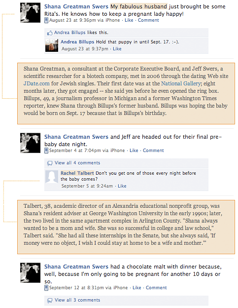 What separates this particular story from other, previously-reported unexpected-death-after-a-happy-milestone stories is how it was told: The reporter, Ian Shapira, and his editor decided to use Facebook. That is, they used the mother’s own Facebook status updates.